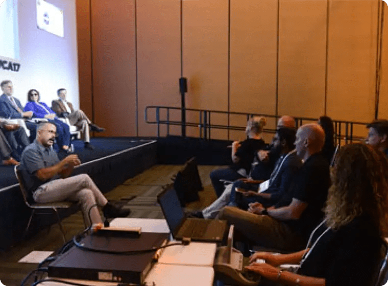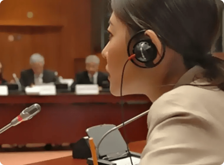 The interpreter sits next to the listener and conducts simultaneous interpreting in a lowered voice so as not to distract or interrupt the speaker.